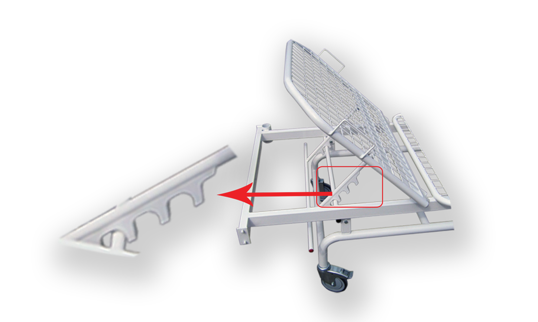 Na zahtev antibakterijski prahom EN 22196:2011 (samo bela boja RAL 9016)Ležeća površina od čelične žice u vidu mreže sa okcima 5 x 5 cm. Prednja i zadnja stranica fiksirane od univera postavljenog u čelični ram.Oslanja se na 4 točka sa kočnicama prečnika 125 mmOpciono: Bez točkovaFunkcijeManuelno podizanje uzglavljaPozicioniranje ugla uzglavlja pomoću zupčaste plastične letve