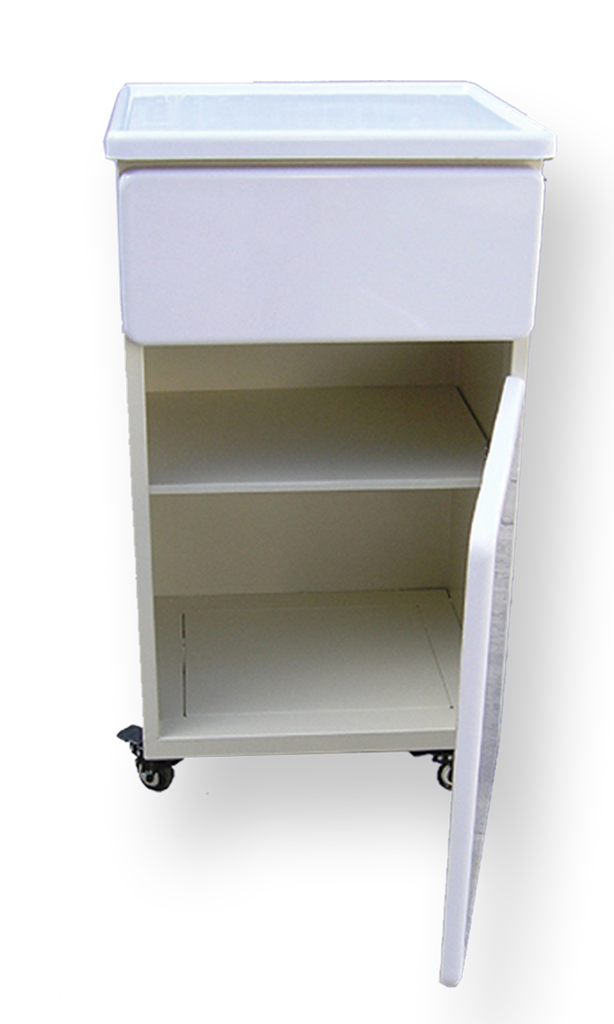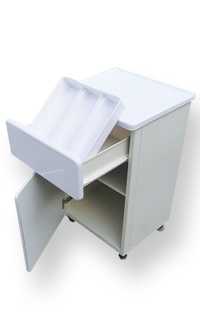 Noćni ormarić kompletno je izrađen od čeličnog lima završno zaštičenog plastifikacijom i NA ZAHTEV ANTIBAKTERIJSKIM PRAHOM EN 22196:2011 (samo bela RAL 9016)Gornja ploča izrađena je od polistirola (PS) i ima rub visine 15 mm koji onemogućava oticanje tečnosti usled eventualnog prosipanja.Vrata i maska fioke izrađena je univera obloženog polistirolom d= 3 mm sa prednje i bočne strane U donjem delu nalazi se pregrada od čeličnog lima koja stvara dva prostora. Prema novim standardima krila vrata i fioka ne poseduju ručice zbog vršenja dezinfekcije.Iz tog razloga postoji razmak od min 3 cm.između fioke i vrata čime se omogućuje otvaranje istih.Fijoka se lako skida sa klizača radi obavljanja čišćenja i dezinfekcijeOpciono postavaljanje gasnog amortizera na fioci kojim se ublažava udar i automatsko zatvaranje.Pokretljivost obezbeđuju točkovi sa kočnicom. Dimenzije:Širina 45 cm Dubina 42 cm Visina 78 cm