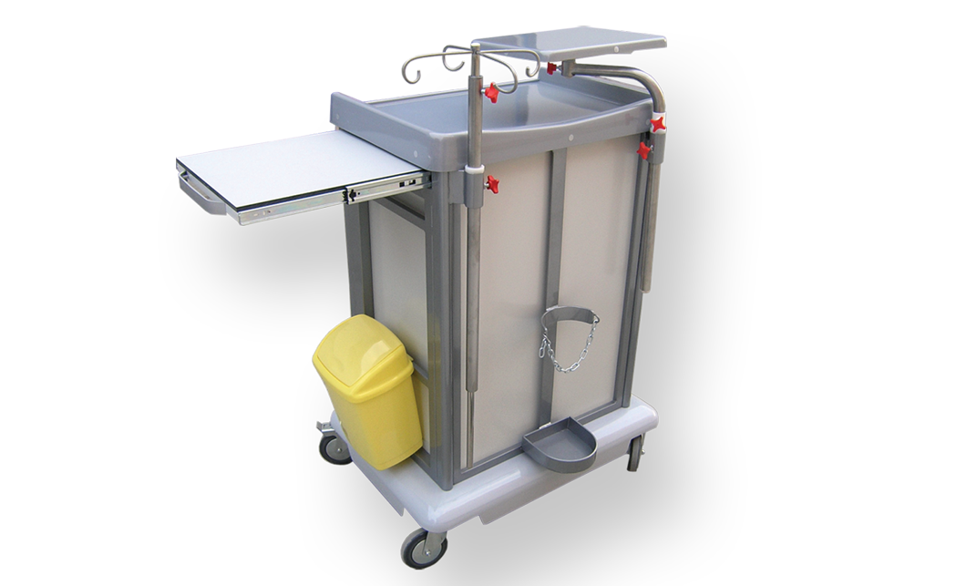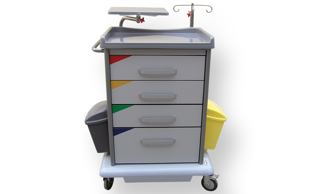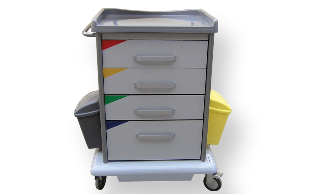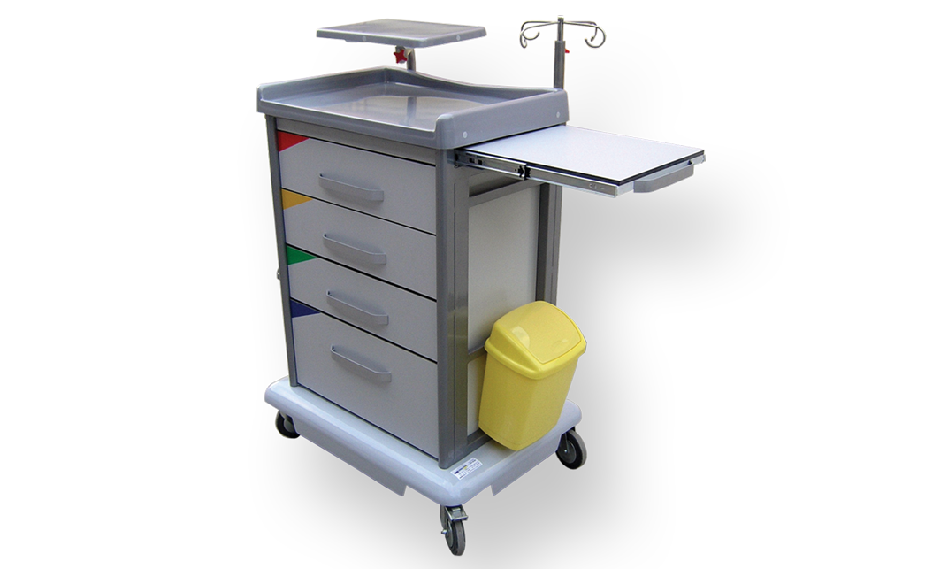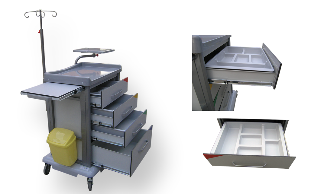 Pokretni ormarić namenjen je za podelu terapije, odlaganje medicinskih instrumenata i sredstava, odlaganje sanitetskog materijala u zdravstvenim ustanovama. .Osnovna konstrukcija izrađena je od čeličnih profila završno zaštičenih plastificiranjem.Bočne strane i zadnja stranica ormarića izrađena je od čeličnog lima završno zaštičenog plastifikacijom i na zahtev antibakterijskim prahomEN 22196:2011 (samo bela boja RAL 9016)Gornja radna površina kao i donja pokrivna ploča za točkove izrađena je od termo formirajućeg polistirola (PS).Gornja radna površina poseduje rub sa tri strane za onemogućavanje eventualnog pada sredstava za terapiju.Poseduje 4 fioke izrađene od čeličnog plastificiranog lima sa prednjom stranom od COMPACT (HPL) ploča. Fijoke su na teleskopskim šinama sa usporivačem za zatvaranje.Unutar fioka nalaze se pregrada od PS -a.Pokretljivost obezbeđuju 4 kvalitetna točka od kojih su dva sa prednje strane sa kočnicom.Sa strane se nalaze nosači od inoxa za eventualno kačenje potrebnihdodataka.Opcije: Dodatna radna površina sa strane na klizačimaNosač infuzionog rastvoraDodatna površina za monitorDodatni nosač boce za kiseonik